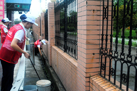 圖為員工對外廣場邊溝衛(wèi)生進行清理