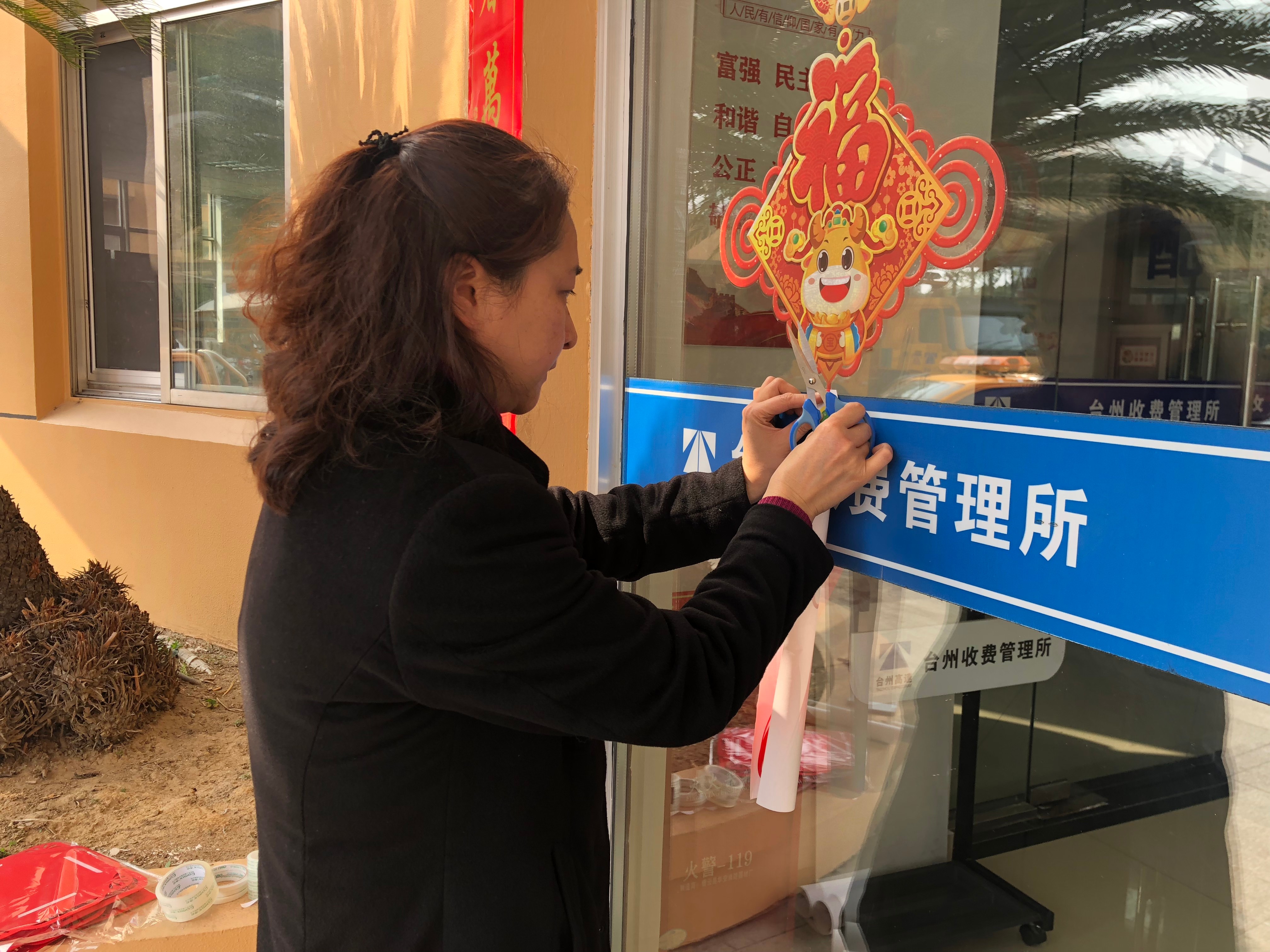 感受年味,喜迎新春 2月7日,臺州收費所員工給站所添點“味兒”。大家分工合作掛燈籠、貼對聯、貼窗花、插彩旗……一盞盞大紅燈籠高高掛起,一幅幅新春對聯溫暖門房,一張張精致窗花鑲嵌窗上,一面面五彩旗幟舞動廣場,整個收費所充滿了新年的味道,溫馨祥和。