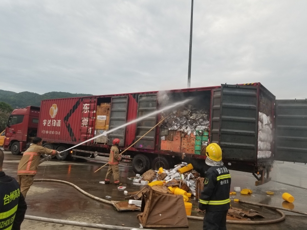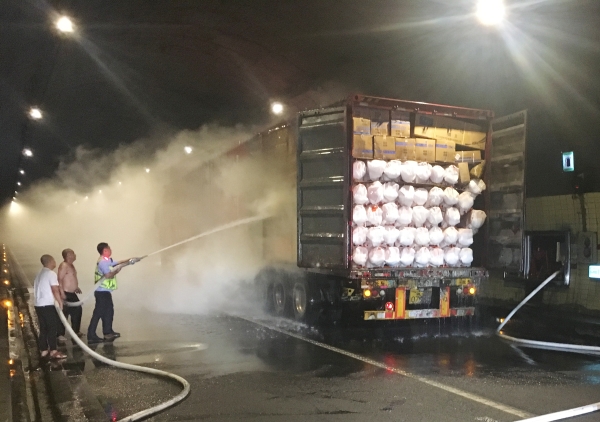 圖為滅火現(xiàn)場 萬幸的是,恰逢溫州高速交警巡邏車經(jīng)過,隨即在該貨車后方預警,很快的所巡邏車、消防車先后到達現(xiàn)場協(xié)同滅火。由于該車貨物較多,且裝載物皆為紙箱和塑料,集裝箱底層溫度較高,一時只能將明火撲滅,但車廂內(nèi)仍有大量煙霧,為了安全,車子必須盡快撤離隧道,執(zhí)勤隊當即決定讓駕駛員把車開往南廣場繼續(xù)滅火,消防車則一路緊隨其后滅火,以防火勢變大。 05:02分,大貨車終于開至南廣場,消防隊員對車上的貨物進行清理,才徹底將此次火災撲滅,隧道恢復安全行車。