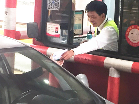 圖為工作人員向過(guò)往司機(jī)發(fā)放施工傳單