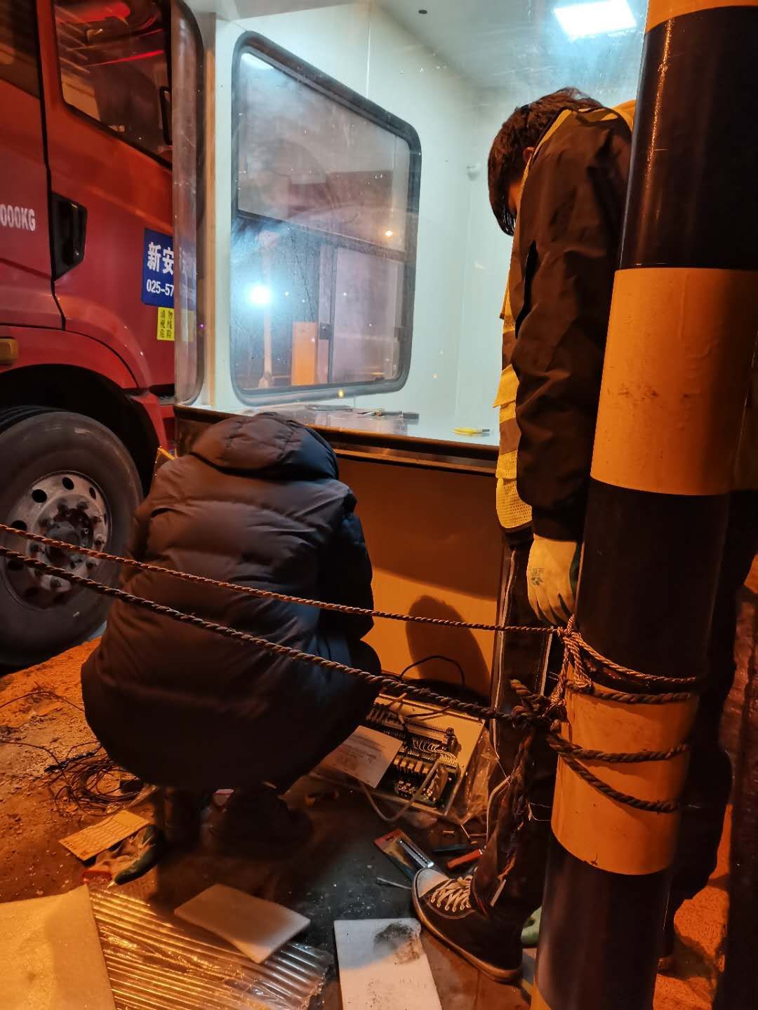 21日下午4點左右,訂購的新崗?fù)ず蛽p壞的設(shè)備設(shè)施陸續(xù)到位,中心值班人員協(xié)同設(shè)備廠家一起將其安放并固定至車道原位置。因崗?fù)A倒時拉斷了底下很多線纜,在拆除設(shè)備時又因為緊急搶修需要沒有作相應(yīng)標(biāo)注,現(xiàn)場各種電線接頭雜亂如麻??紤]到夜間查線、接線存在一定的安全隱患,也不利于施工,搶修人員決定第二天再戰(zhàn)。